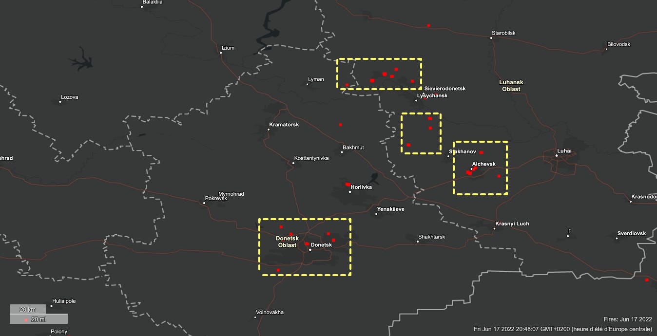 Comme on le constate ici, plusieurs sources de chaleur dans le Donbass, notamment autour de Severodonetsk, mais surtout dans la ville de Donetsk au 17 Juin, confirmant l’information au sujet des tirs ukrainiens sur la ville.