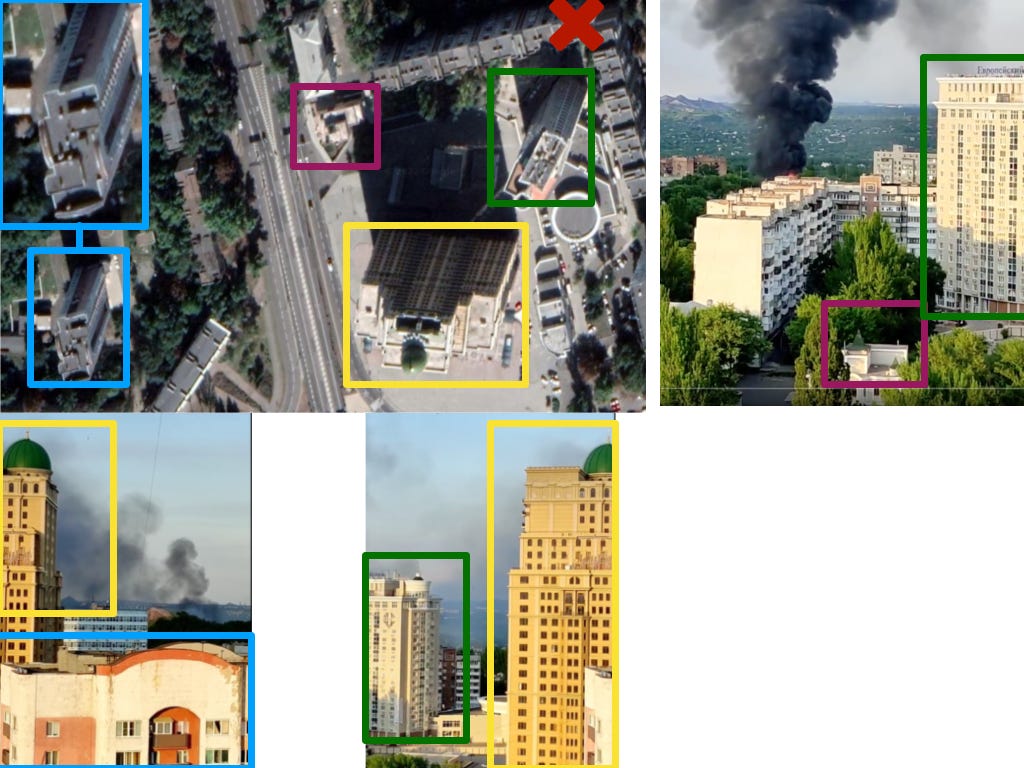 Les bâtiments de la vidéo sont assez singuliers par rapport aux autres bâtiments de la ville, et finalement, après avoir vérifié les angles des infrastructures, j’ai trouvé la position exacte de la seconde colonne de fumée qui sortait d’un immeuble d’habitation aux coordonnées : 48.0395966, 37.7822553 .